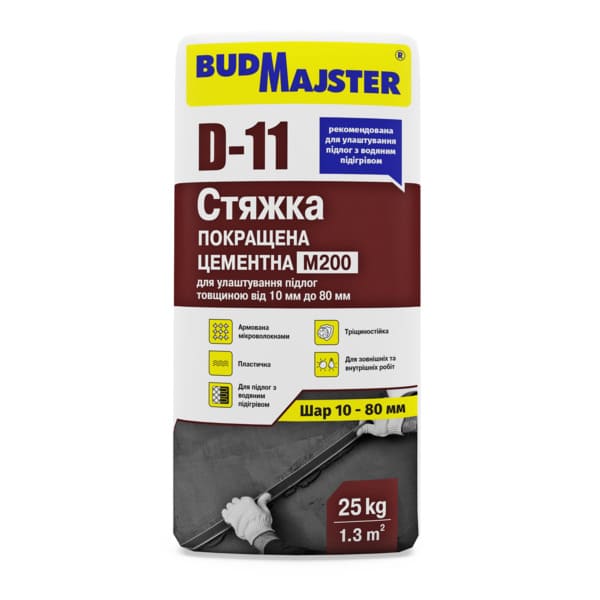 Предназначена для укладки и ремонта полов внутри и снаружи зданий; для устройства полов под уклоном; для подготовки оснований под нивелировочные смеси: D-108, D-318 или D-319, а также под укладку ламината, ковролина, линолеума и керамических покрытий. Устройство стяжки может производиться по разным конструктивным схемам: связано с основанием, на разделительном (min 30 мм) или теплоизоляционном (min 40 мм) слое и в обогреваемых полах. Стяжку применяют на крепких основаниях. Рекомендуемая толщина слоя от 10 мм до 80 мм.