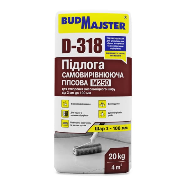 BUDMAJSTER D-318. Смесь для пола самовыравнивающаяся гипсовая М250 для ручной и машинной выливки, 20 кг. Купить, цена, продажа, оптом, со склада. Киев, Украина