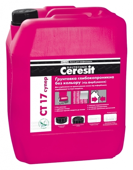 Грунтовка Ceresit СТ 17 супер - это укрепляющее средство для непрочных пористых оснований, которые имеют высокие впитывающие свойства. Также, одно из основных задач, которые выполняет грунтовка Ceresit СТ 17 супер - это пропитка таких оснований (например, поверхности из гипса или кирпича, легкий бетон и штукатурка).